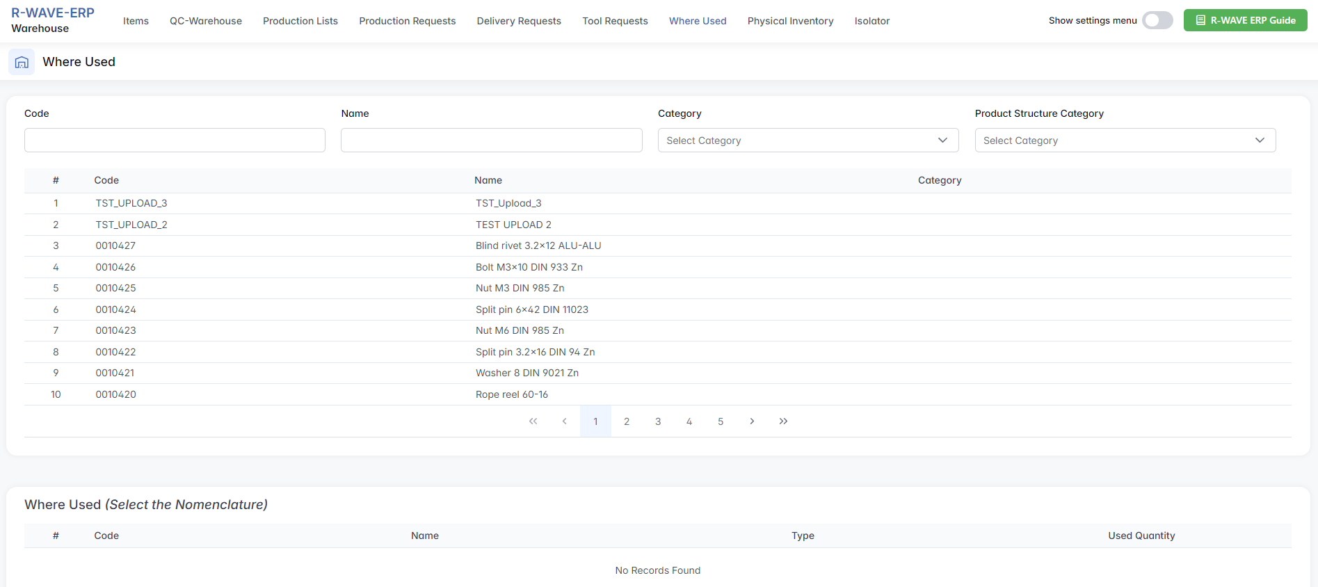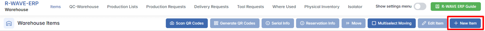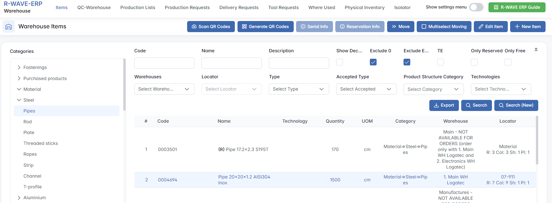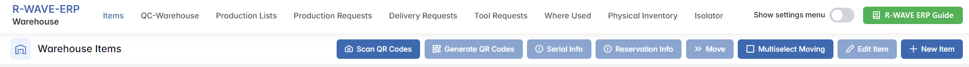 The Warehouse Items module in the R-Wave ERP system provides a centralized overview of all stock items currently registered in the warehouse. It enables users to search, filter, view, and manage items across different warehouse locations, categories, and item types. This section plays a key role in production preparation and stock monitoring.