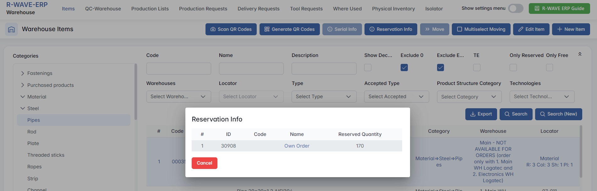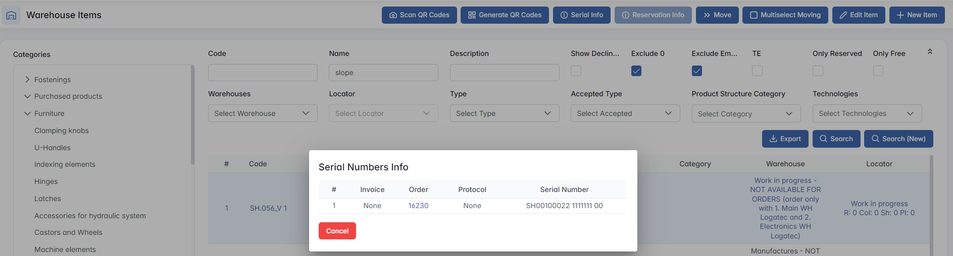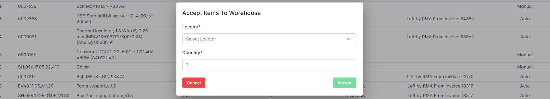 This module supports warehouse staff by offering visibility into item status, location, and movement history. It also ensures that item flows - whether incoming, outgoing, reserved, or defective - are traceable and efficiently managed.