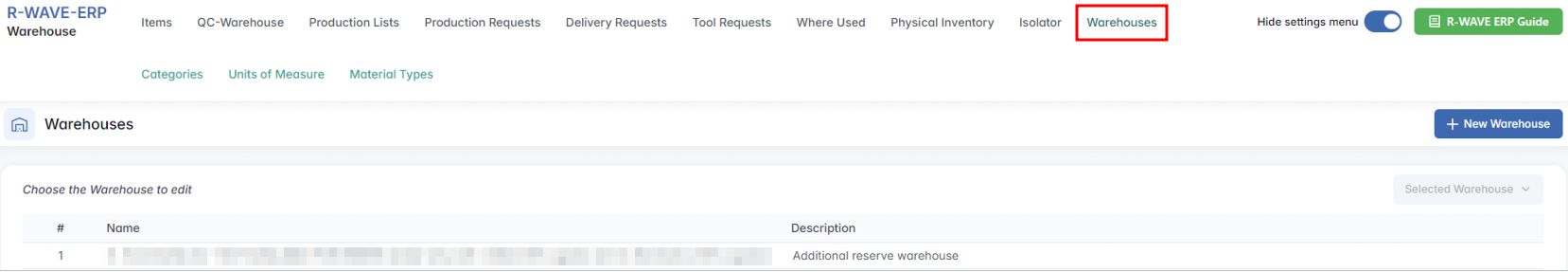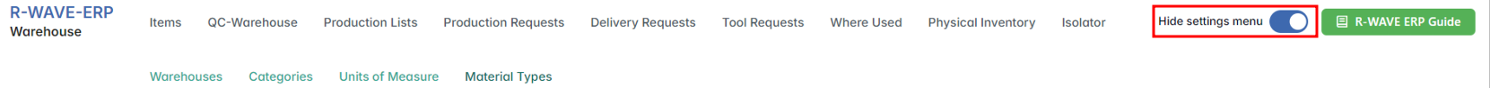 The Warehouse module includes a Hidden Settings Menu, which can be accessed by enabling the Show settings menu toggle switch located in the top-right corner of the screen.