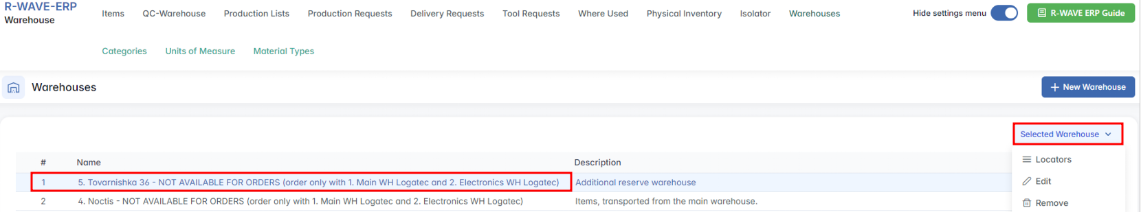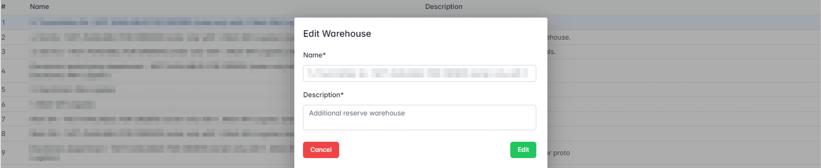 - Edit - Open the Edit Warehouse popup to change the name or description.