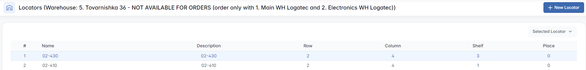 When clicking Locators for a selected warehouse, a new page opens titled: Locators (Warehouse: [Warehouse Name])