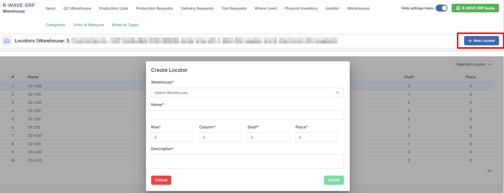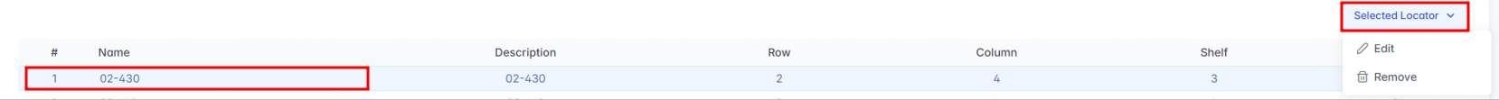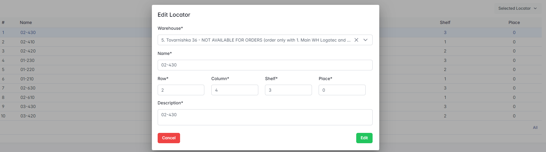 This page lists all physical locator positions inside the selected warehouse, showing their grid coordinates and descriptions.
