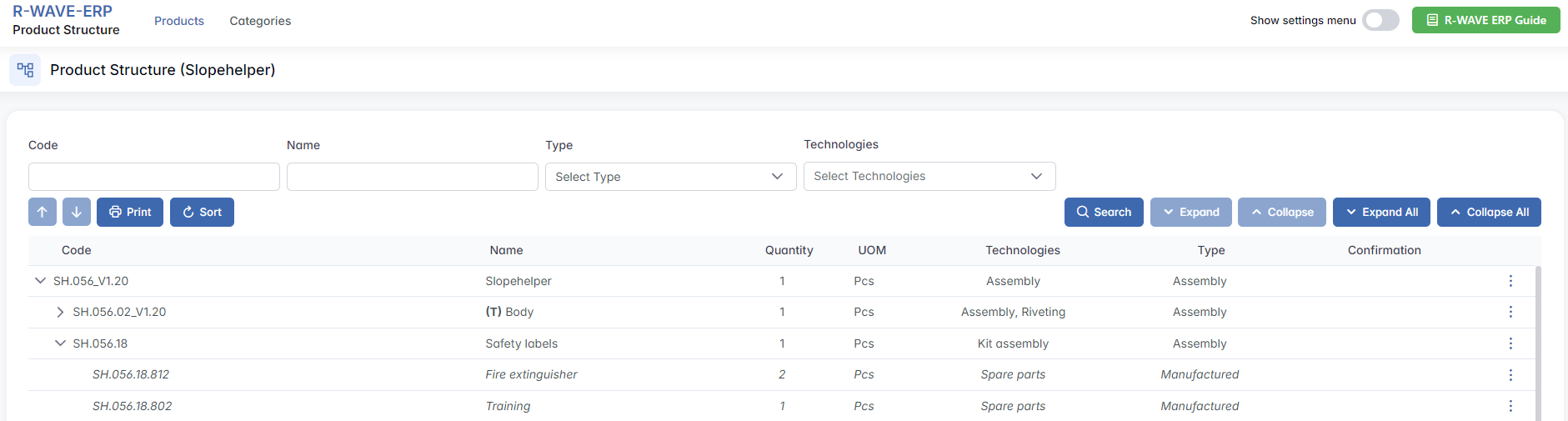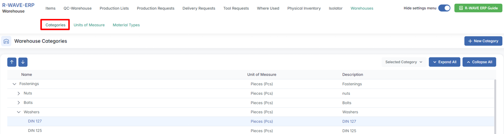 This section allows to define and organize nomenclature categories within the warehouse system. Categories help classify nomenclature for easier filtering, grouping, and locating in reports, inventory, and operations.