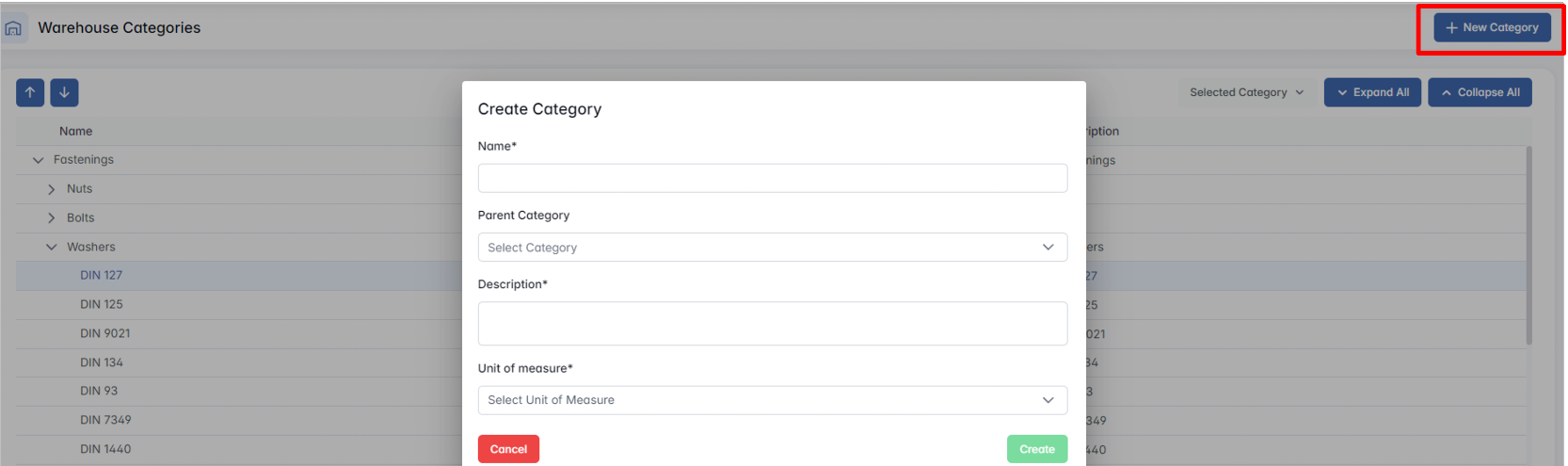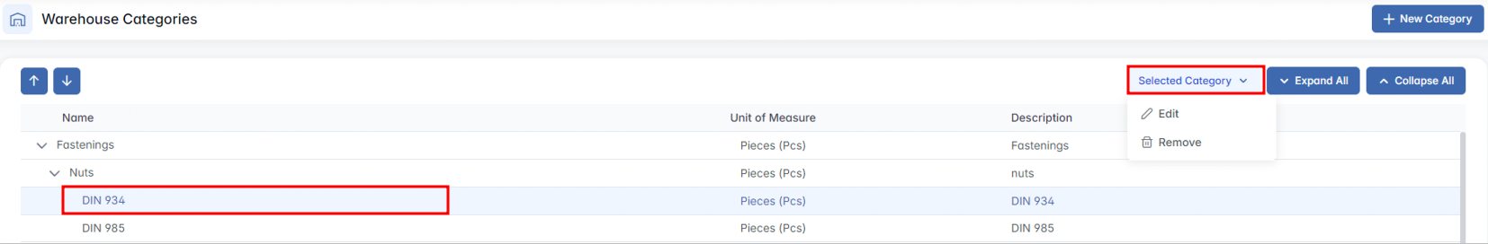 - Edit - opens a pop-up window where you can change thename, parent category, description, or unit of measure