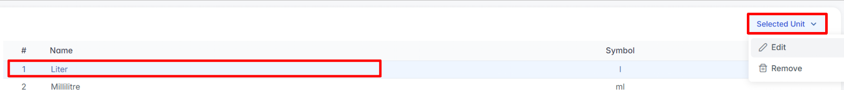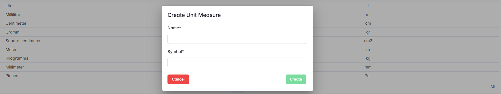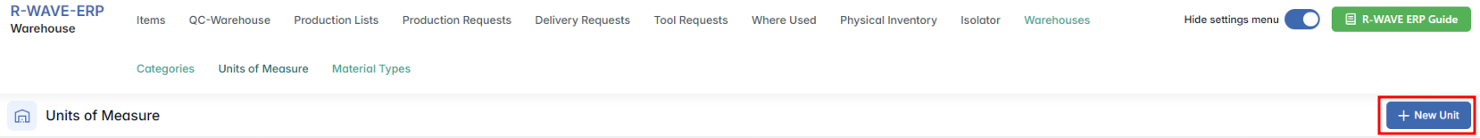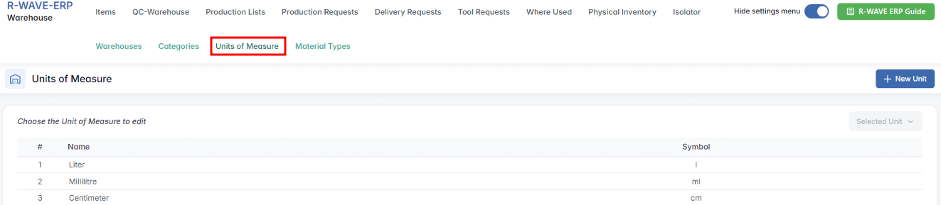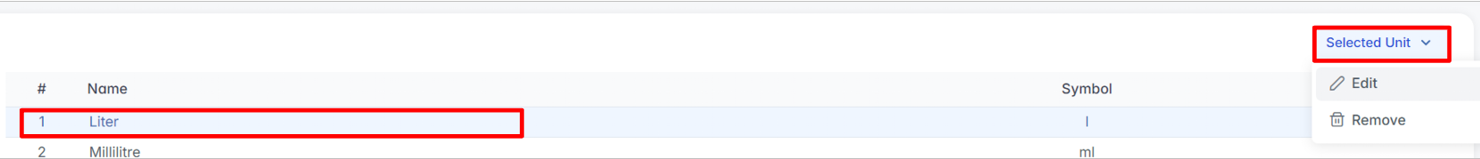The Units of Measure section allows you to manage all measurement units used across the Warehouse module (such as liters, grams, pieces, etc.). These units are associated categories and ensure consistency in inventory tracking, procurement, and reporting.