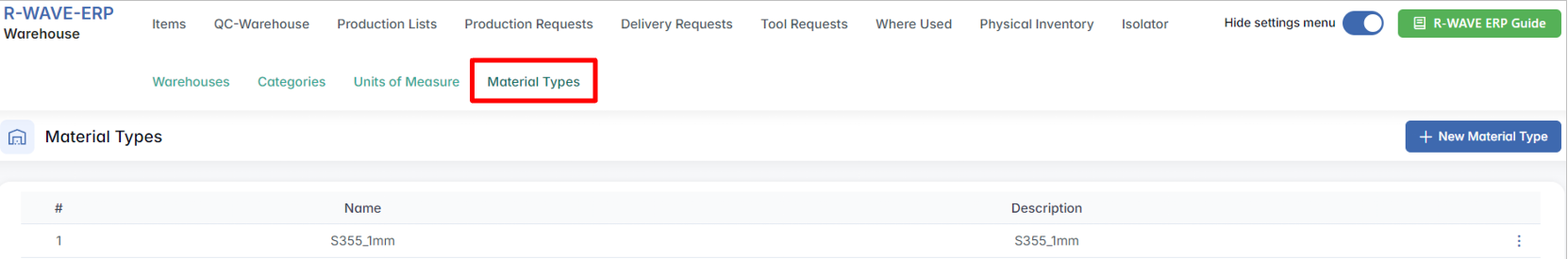 The Material Types section in the Warehouse module allows users to define and manage types of materials. Each material type includes a Name and a Description to distinguish it during warehouse and production operations.