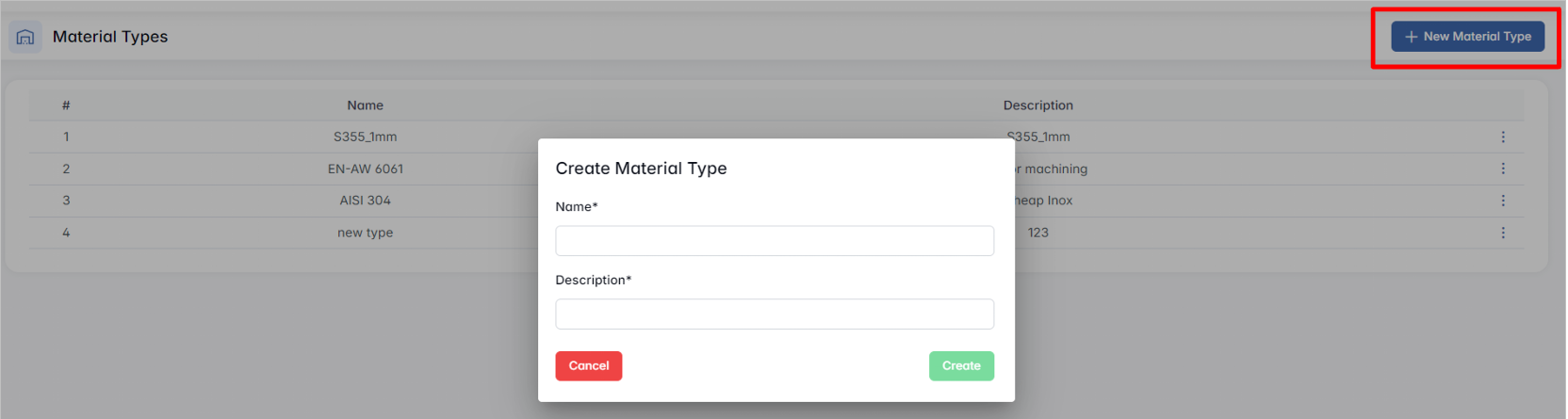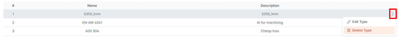- Edit Type - Opens the Edit Material Type modal with current values pre-filled.