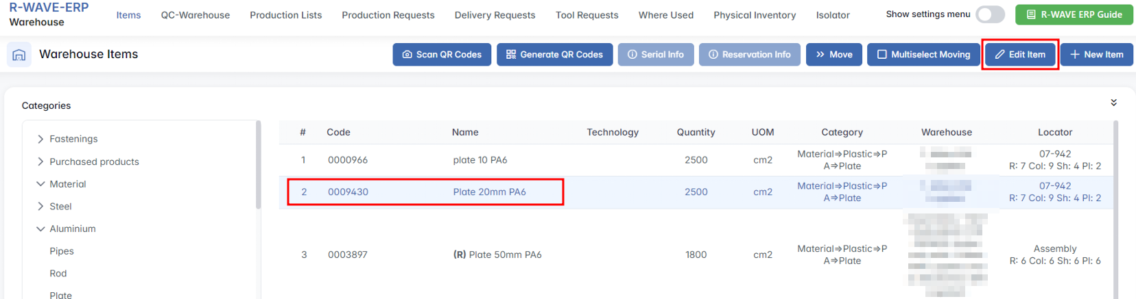 Editing Existing Items: To edit an existing item in the warehouse table, you need to make sure that Multiselect Moving is not active.