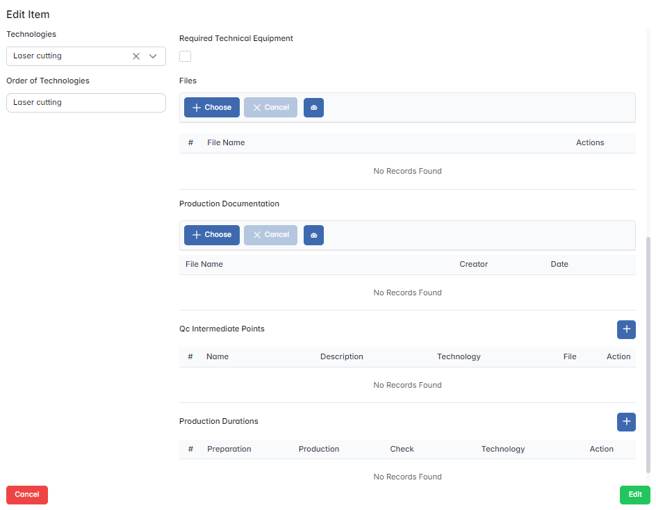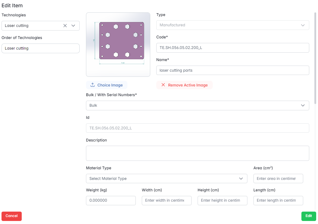 Technologies: A multi-select field where you can assign one or more technologies (e.g., Laser Cutting) associated with the production of this item.