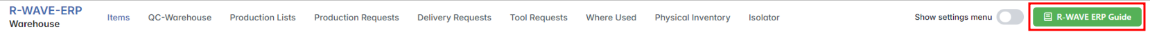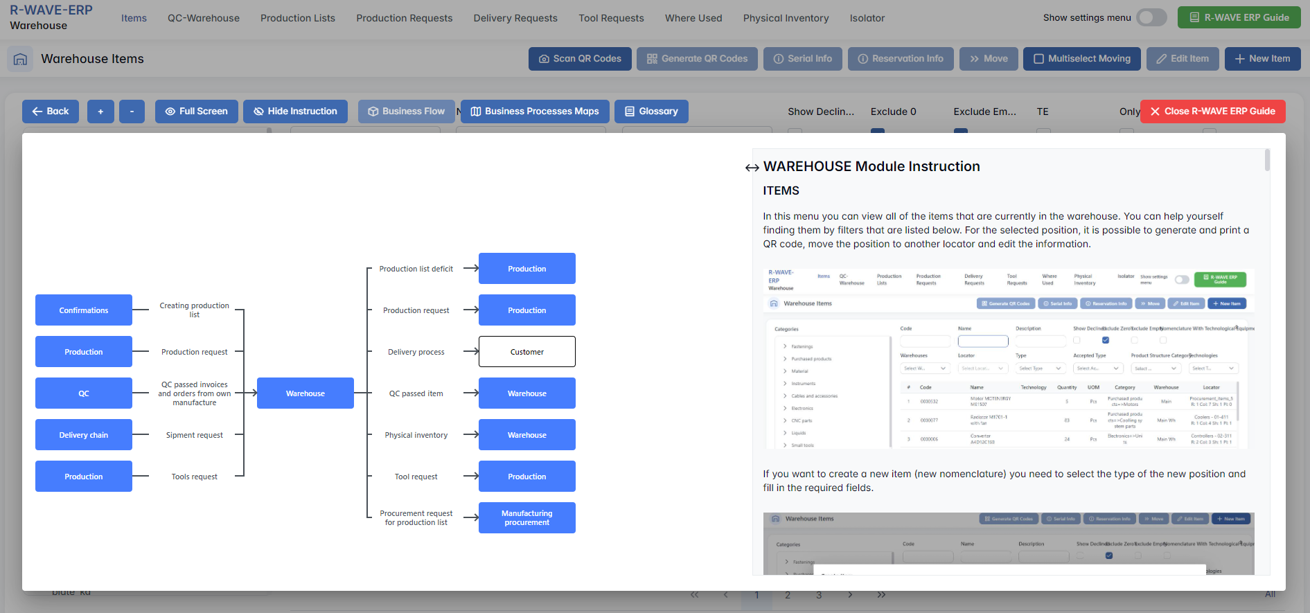 To support user navigation and clarity, R-Wave ERP includes a built-in contextual help system in the form of a pop-up guide window. This feature is available across different modules, including Warehouse, and is designed to help users understand where they are in the system and how to use the current section effectively.