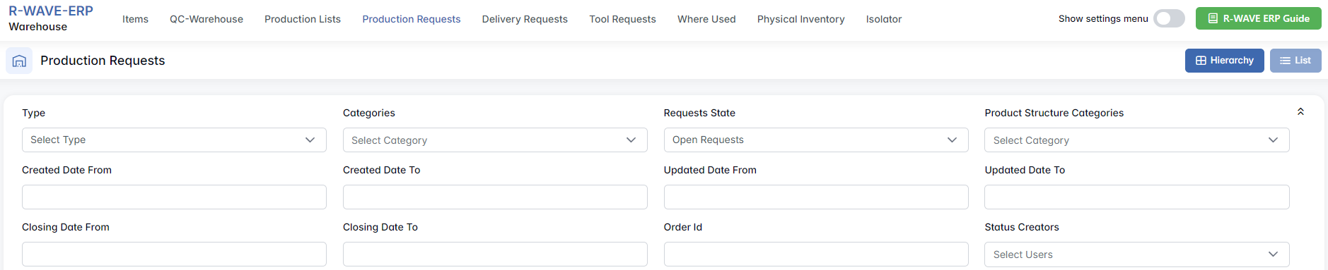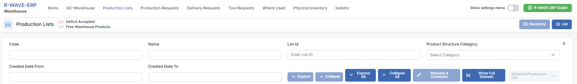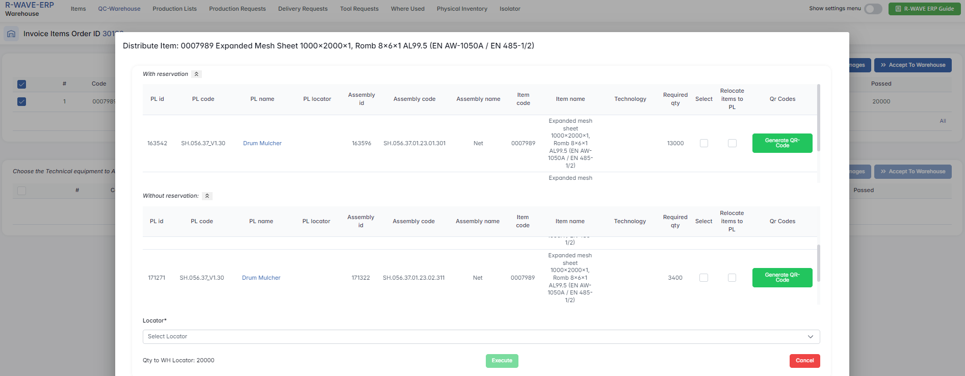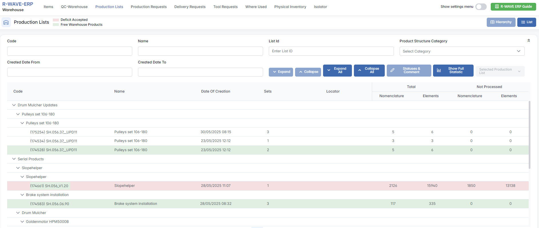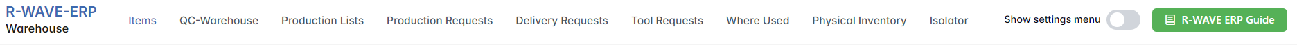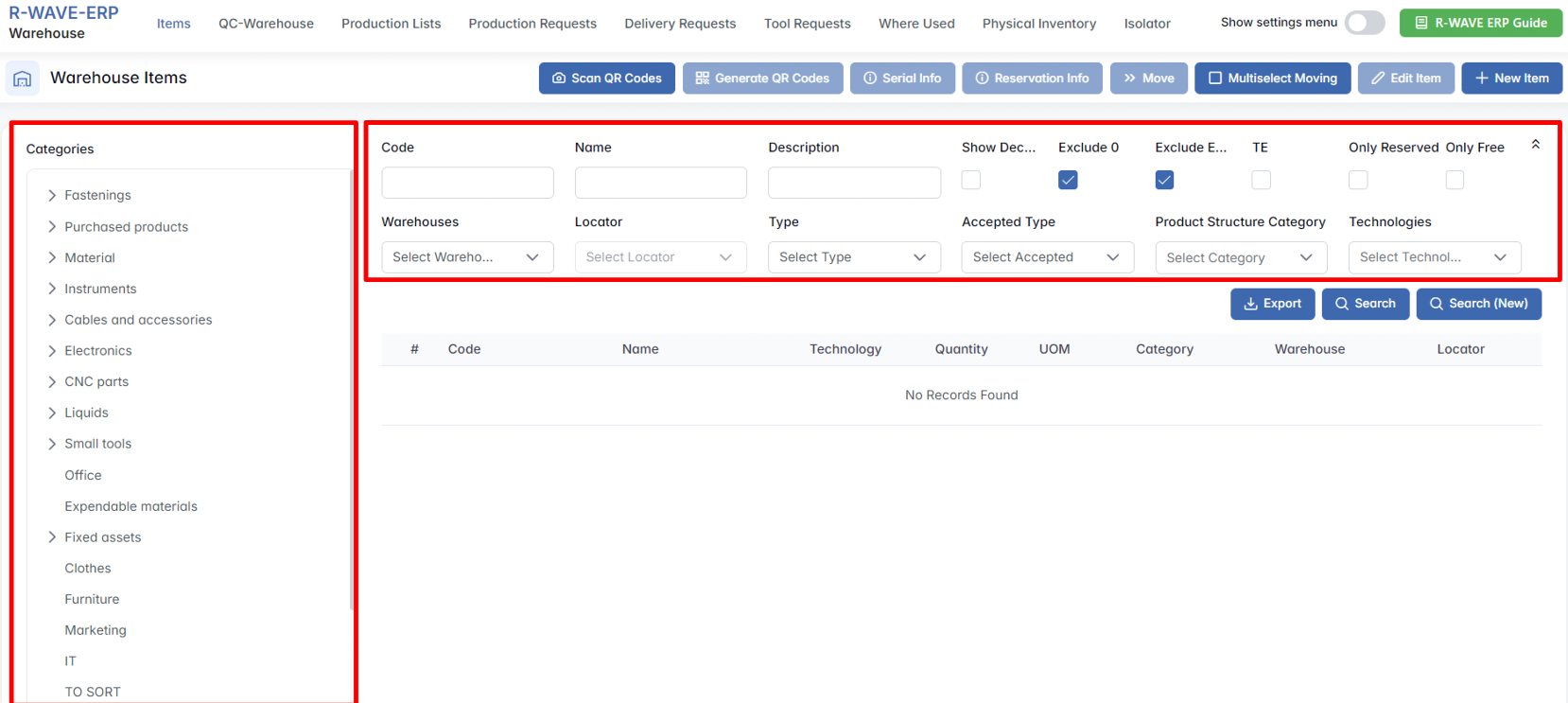 The Warehouse module in the R-Wave ERP system is designed for managing and organizing all items stored in the warehouse. It provides structured access to all item-related operations - from tracking stock and monitoring availability to preparing materials for production and handling warehouse workflows.