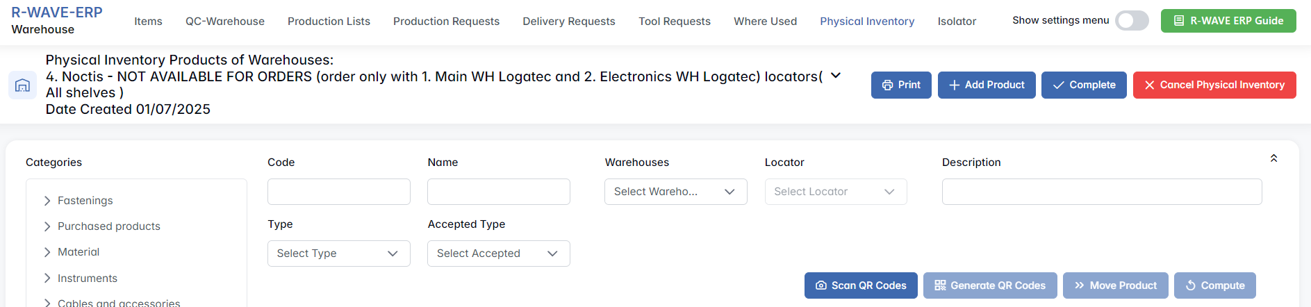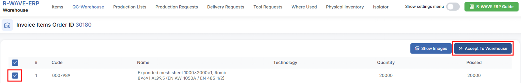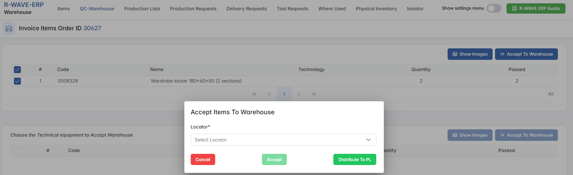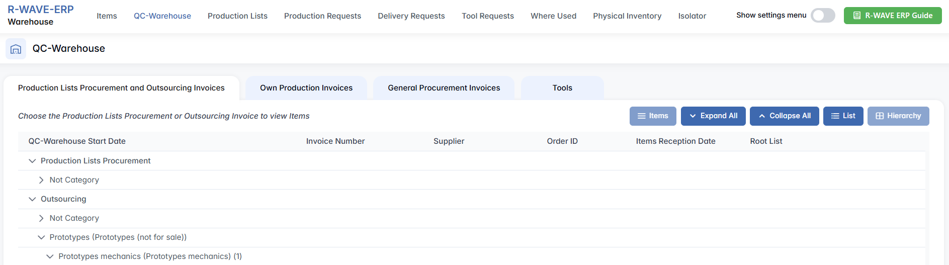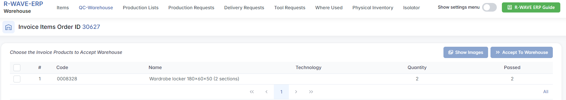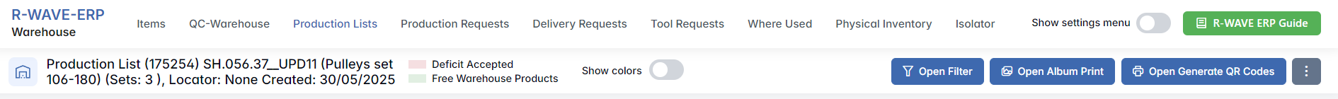 The Warehouse module in the R-Wave ERP system is designed for managing and organizing all items stored in the warehouse. It provides structured access to all item-related operations - from tracking stock and monitoring availability to preparing materials for production and handling warehouse workflows.