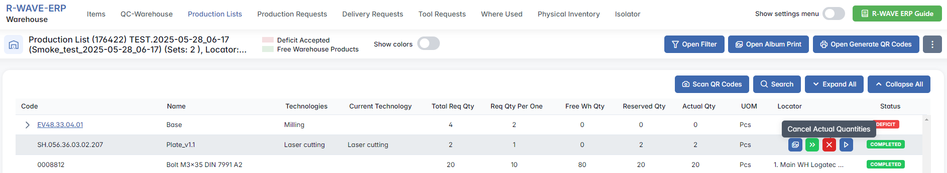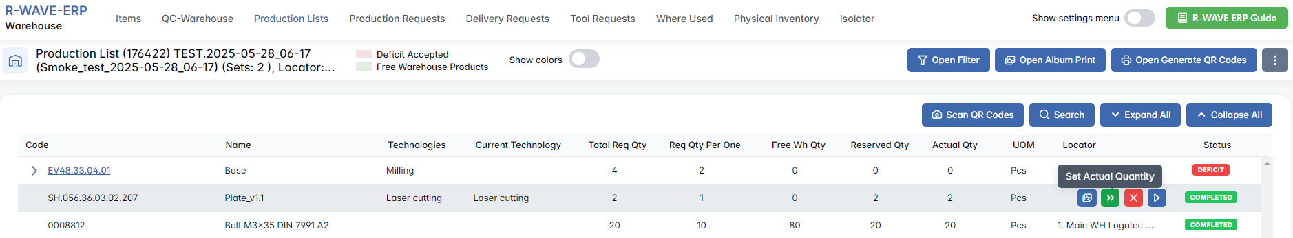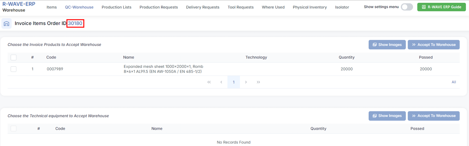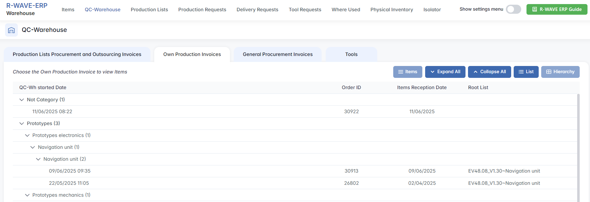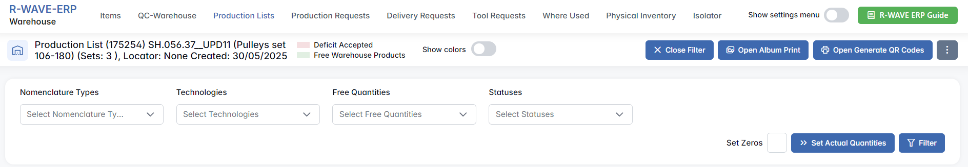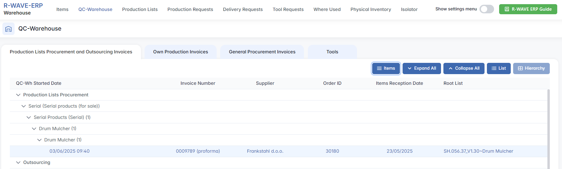The Warehouse module in the R-Wave ERP system is designed for managing and organizing all items stored in the warehouse. It provides structured access to all item-related operations - from tracking stock and monitoring availability to preparing materials for production and handling warehouse workflows.