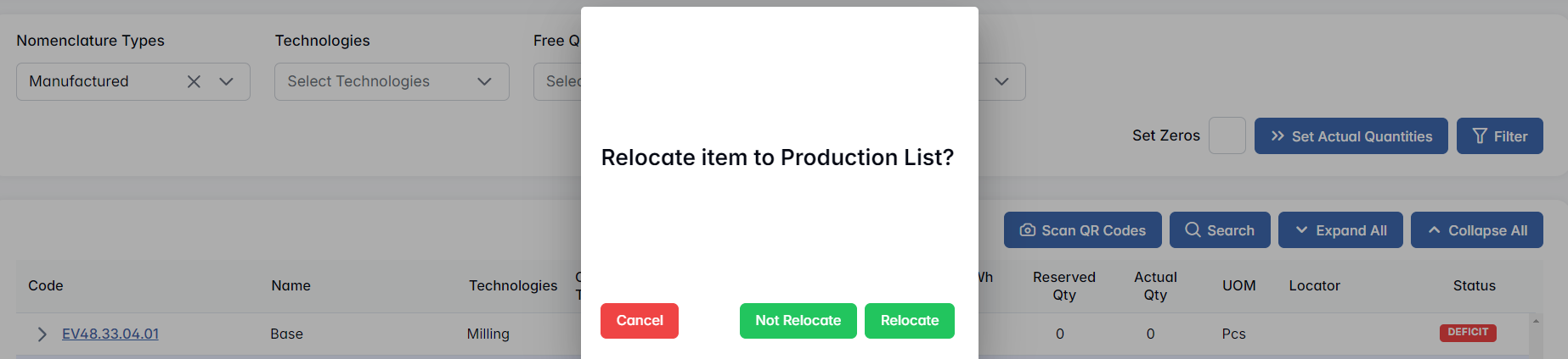 - If the nomenclature name includes "(T)", it means that specific technological equipment is assigned to the item. This equipment is required for production and must be issued when the item is ordered. The assigned equipment can be configured in the item's detail card.